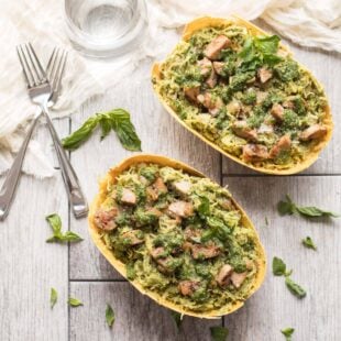 Spaghetti Squash with Pesto & Sausage (Paleo, Whole30)