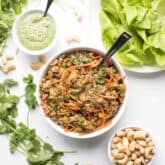 A quick and healthy dinner recipe with ground chicken, sauteed onions, a thai sauce, cilantro and shredded carrots. Topped with a bright and fresh herby green dressing and cashews.